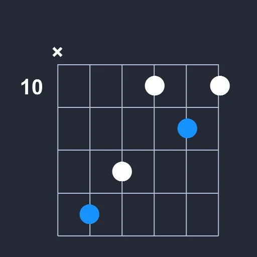 - Play a barre on the 10th fret from the 4th string to the 6th string.