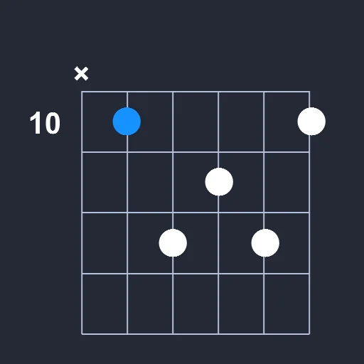 - Play a barre on the 10th fret from the 2nd string to the 6th string.